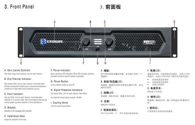性能全面的Crown KVS 系列功放擁有卓越的可靠性與穩定性,該系列共有4個型號:KVS300 / KVS500 / KVS700 / KVS1000,其輸出功率的覆蓋范圍從2*300W至2*1000W,能夠完全勝任如KTV等娛樂場所的應用。